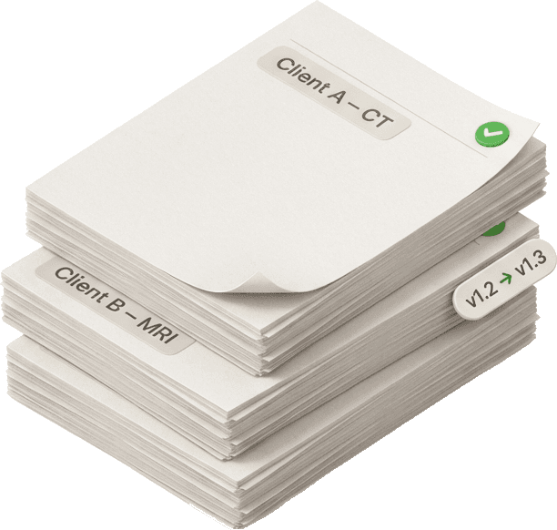Client-specific templates and structured outputs aligned to your style guide, consistent delivery even when you route volume to us.